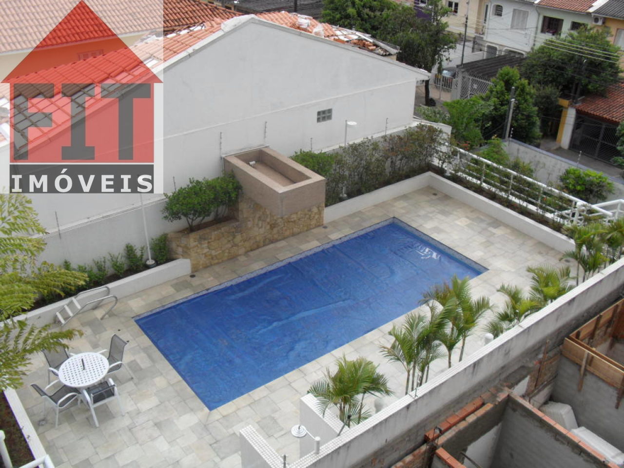 PRÉDIO COM PISCINA, ACADEMIA, CHURRASQUEIRA, SALÃO DE FESTAS, E UMA FONTE COM CARPAS.