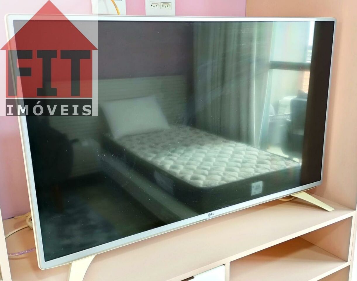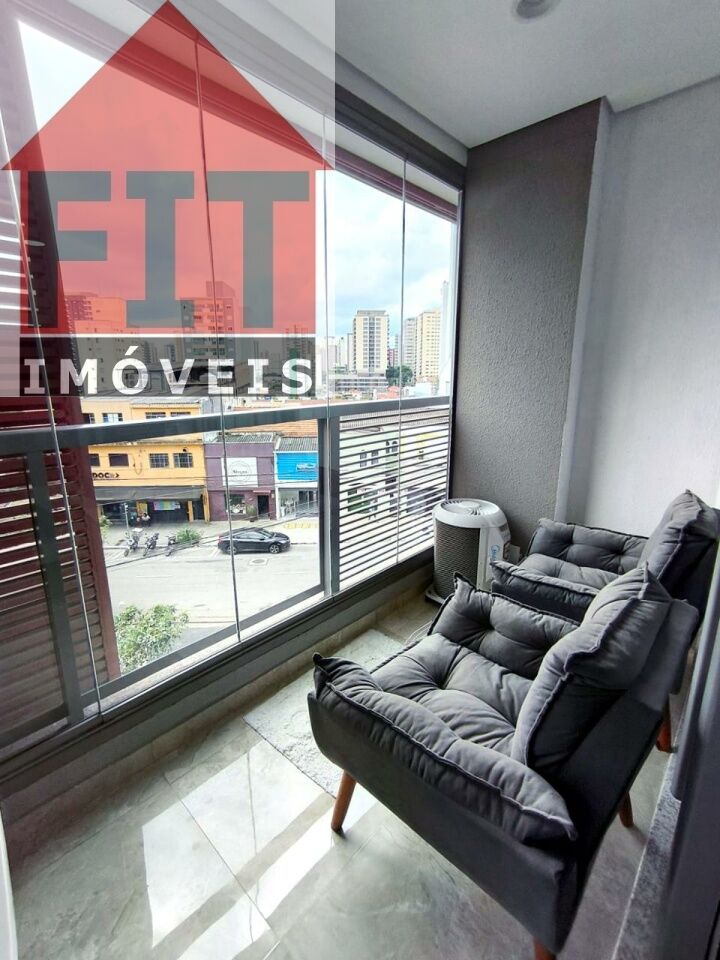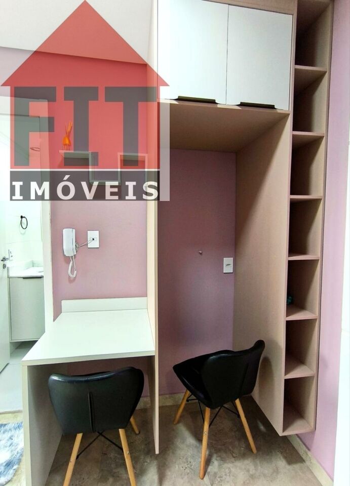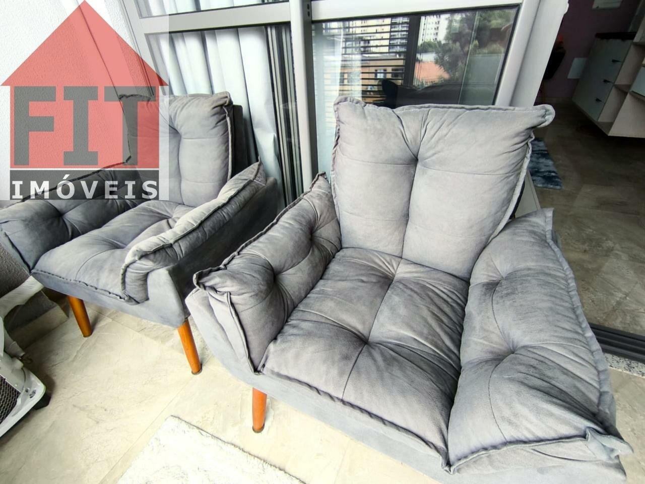 Terraço envidraçado, com brises de privacidade, guarda corpo em vidro e duas poltronas. Armários na cozinha, dormitório e banheiro, bancada home office com cadeiras e estante, poltrona, cama, ar-condicionado, TV 32', cooktop, microondas, cortina, tapetes, tanque e piso em porcelanato de alto padrão.